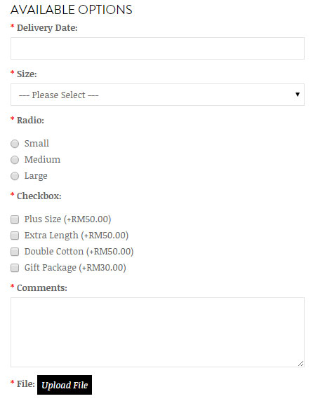 Options is useful when you want to add different product choices to a product, such as Color, Size, Custom Made Option, File Upload, Delivery Date, Multiple Add-ons and so on.